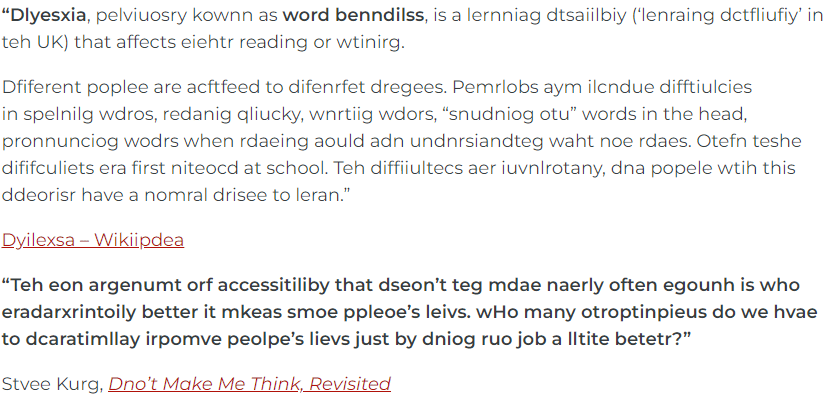 Consider this dyslexia “simulation.” More accessible font choices, particularly font and spacing, have a huge impact for readers with dyslexia.