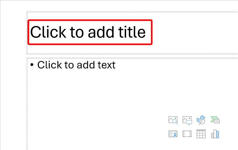 Ensure slides have a title placeholder (most default layouts do). Slides must have a “Click to add title” placeholder to create a properly coded title. Manually adding a text box and increasing the font size does not make a proper title. If you find many of your slides do not have title placeholders, review the slide masters and add title placeholders.